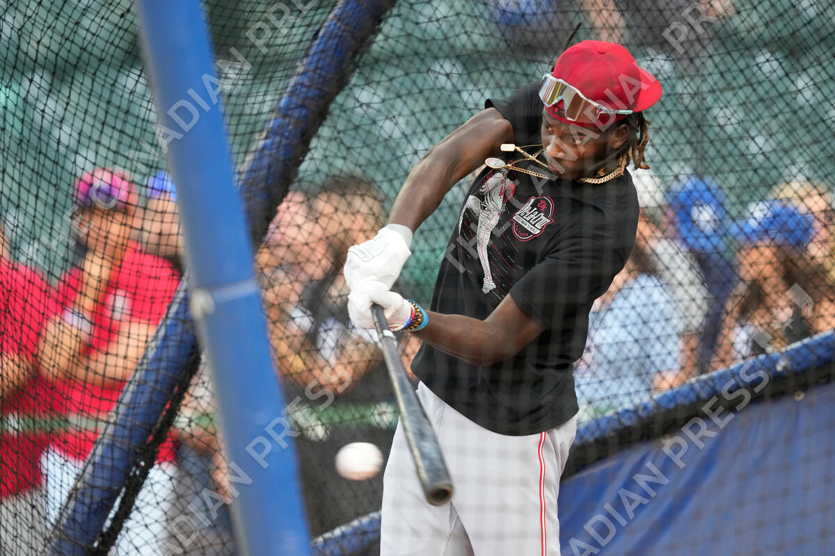 Cincinnati Reds' Elly De La Cruz participates in batting practice before a baseball game against the Chicago Cubs, Monday, July 31, 2023, in Chicago. (AP Photo/Charles Rex Arbogast)