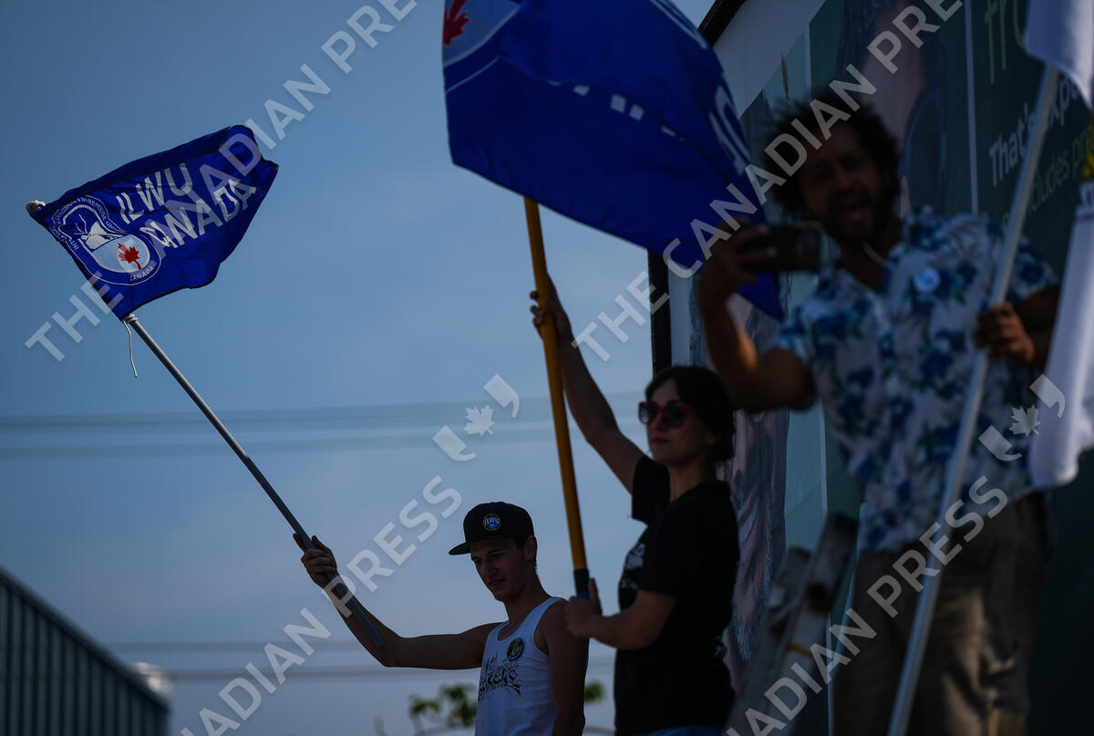 Striking port workers from the International Longshore and Warehouse Union Canada attend a rally, in Vancouver, on Thursday, July 6, 2023. The union representing about 7,400 workers in the British Columbia port dispute has been warned by the Canada Industrial Relations Board that changing its mind about a new deal during ratification would be an "unfair labour practice." THE CANADIAN PRESS/Darryl Dyck