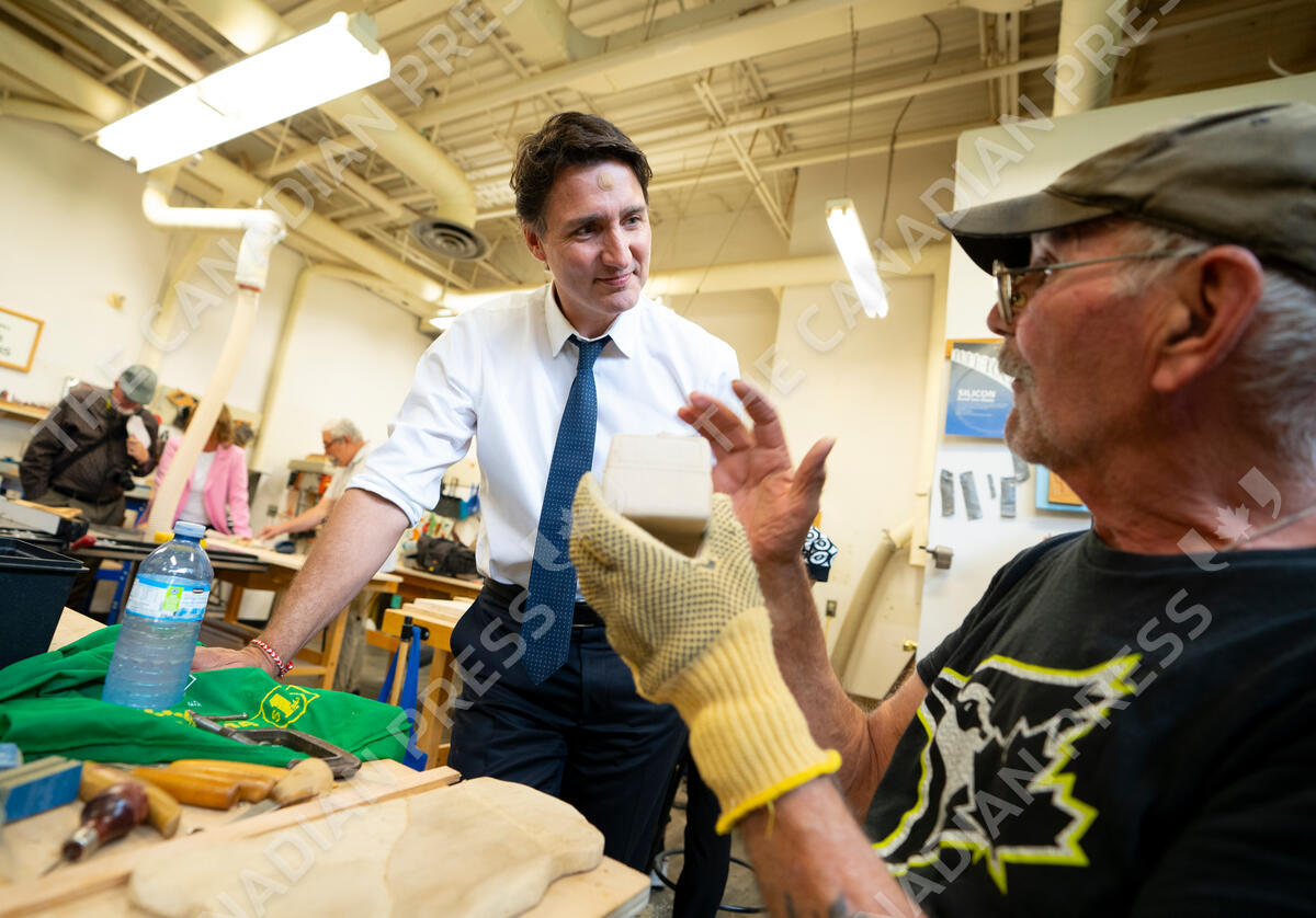 Prime Minister Justin Trudeau chats with Bob McLaughlin, 72, about his wood working project during a visit to Sackville Hill Senior Recreation Centre in Hamilton, Ont., Monday, July 31, 2023. THE CANADIAN PRESS/Peter Power