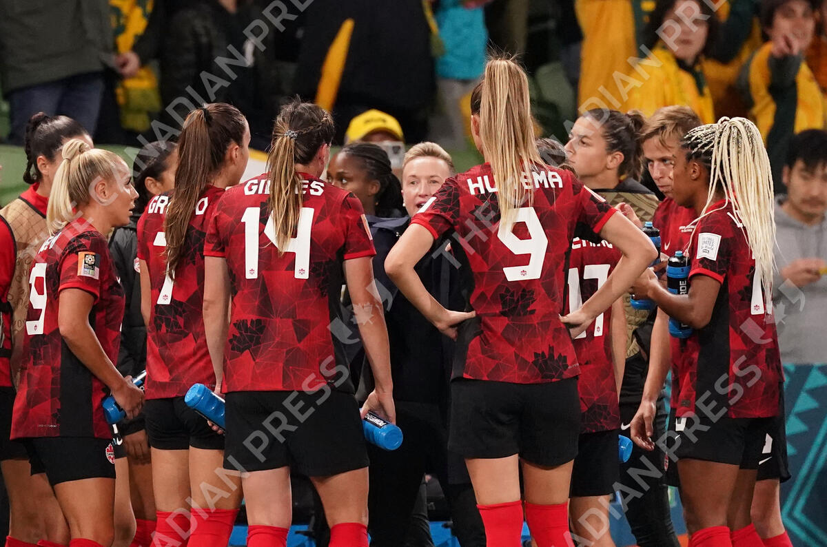 Canada coach Bev Priestman speaks to her team during a break in their Group B soccer match against Australia at the FIFA Women's World Cup in Melbourne, Australia, Monday, July 31, 2023. THE CANADIAN PRESS/Scott Barbour