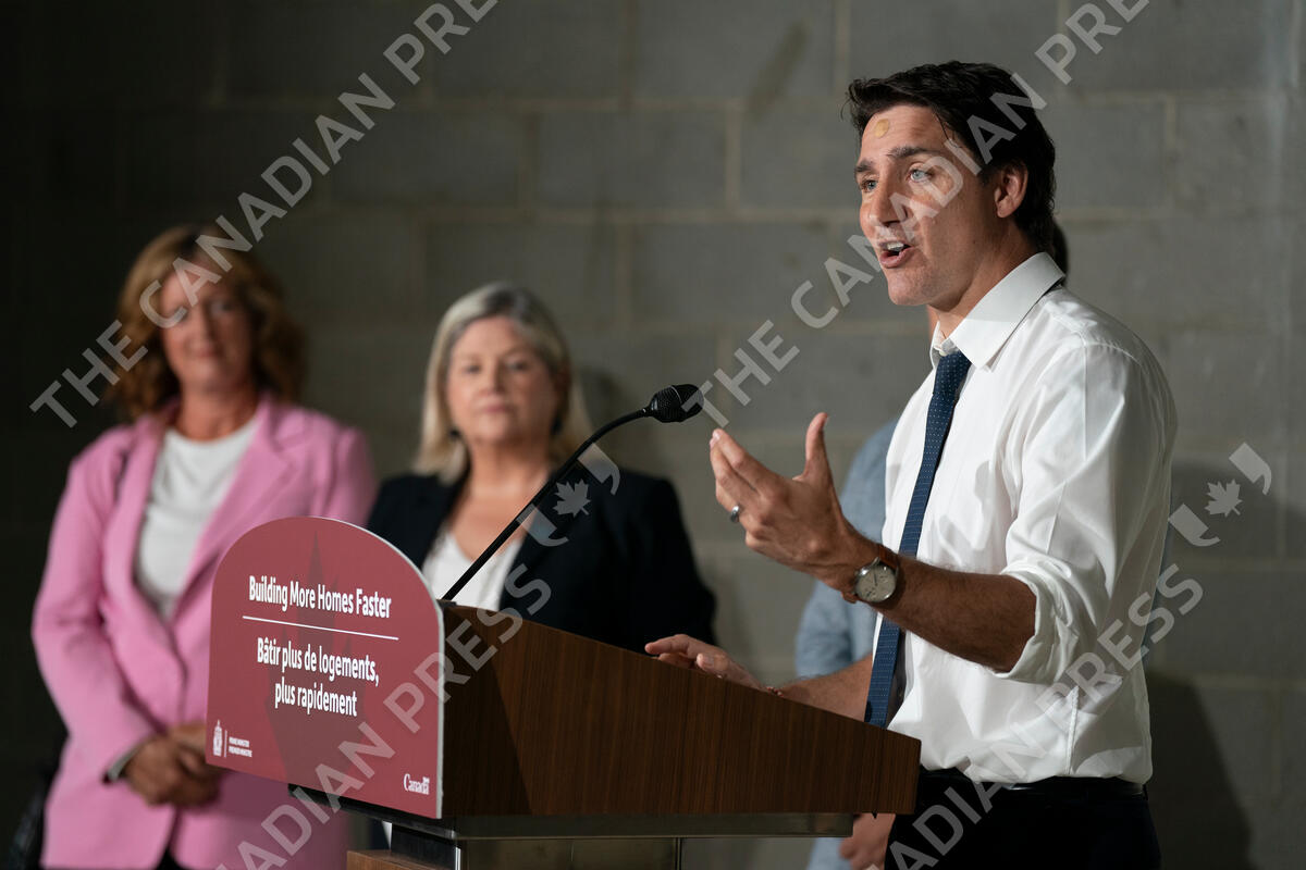 Prime Minister Justin Trudeau speaks during a visit to an apartment complex under construction in Hamilton, Ont., Monday, July 31, 2023. He was joined today by the Mayor of Hamilton, Andrea Horwath, to announce a joint investment of nearly $64 million from the Government of Canada and the City of Hamilton to build and repair 214 homes for families in the city. THE CANADIAN PRESS/Peter Power