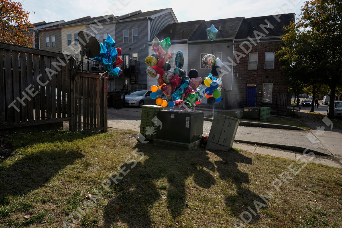 A makeshift memorial of balloons, stuffed animals, and photographs is seen Monday, Nov 6, 2023, in Cincinnati, for Dominic Davis, an 11-year-old boy, who was killed in a weekend shooting. Police Chief Terri Theetge told reporters Sunday that a shooter in a sedan fired 22 rounds "in quick succession" into a crowd of children just before 9:30 p.m. Friday on the city's West End. (AP Photo/Carolyn Kaster)