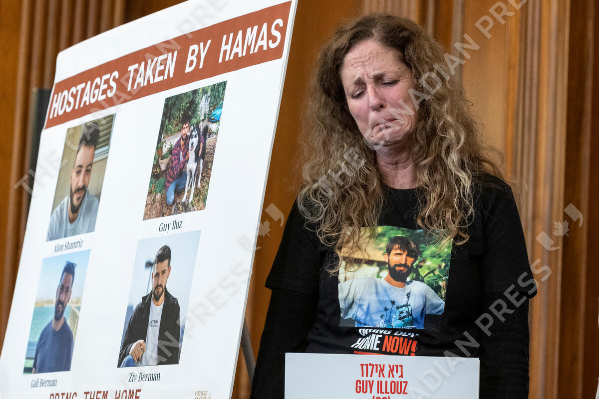 Doris Liber, whose son, Guy Iluz, is being held hostage in Gaza, holds in her emotions during a news conference with House Republicans at the Capitol in Washington on Tuesday, Nov. 7, 2023. (AP Photo/Amanda Andrade-Rhoades)