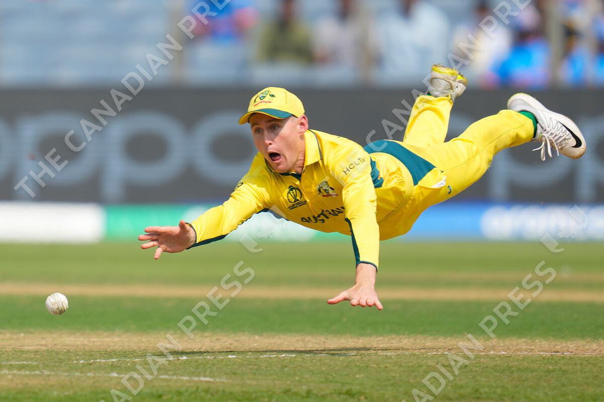 Australia's Marnus Labuschagne fields a ball during the ICC Men's Cricket World Cup match between Australia and Bangladesh in Pune, India, Saturday, Nov. 11, 2023. (AP Photo/Rafiq Maqbool)