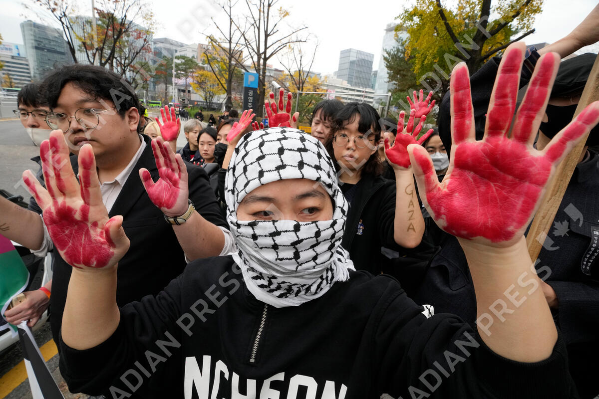 Supporters for Palestinian people stage a rally to denounce a visit by U.S. Secretary of State Antony Blinken in front of the Foreign Ministry in Seoul, South Korea, Thursday, Nov. 9, 2023. Heightened tensions on the Korean Peninsula, suspected North Korean cooperation with Russia in its war on Ukraine and concerns about China's growing assertiveness topped U.S. Secretary of State Antony Blinken's agenda in South Korea on Thursday. (AP Photo/Ahn Young-joon)