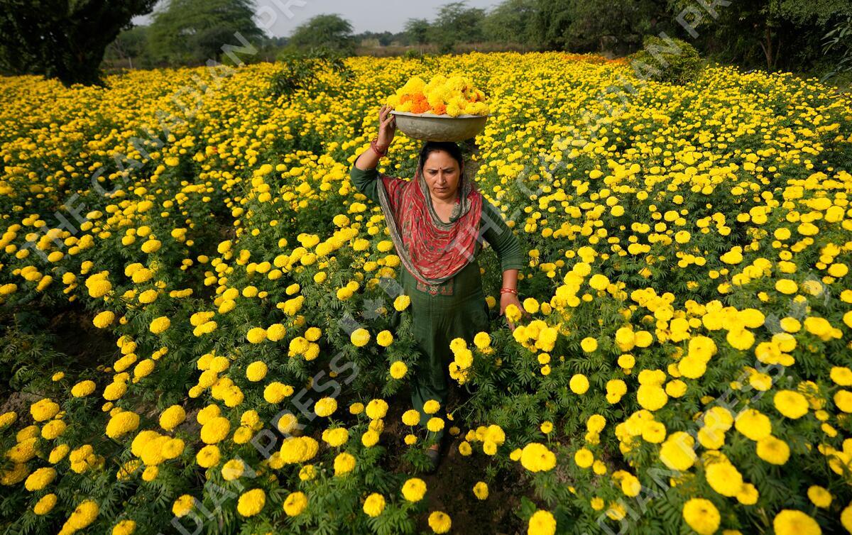 A woman collects marigold flowers, to be used for rituals and decorations, ahead of Diwali Festival on the outskirts of Jammu, India, Thursday, Nov. 9, 2023. Hindus light lamps, wear new clothes, exchange sweets and gifts and pray to goddess Lakshmi during the festival of lights, that will be celebrated on Nov. 12. (AP Photo/Channi Anand)