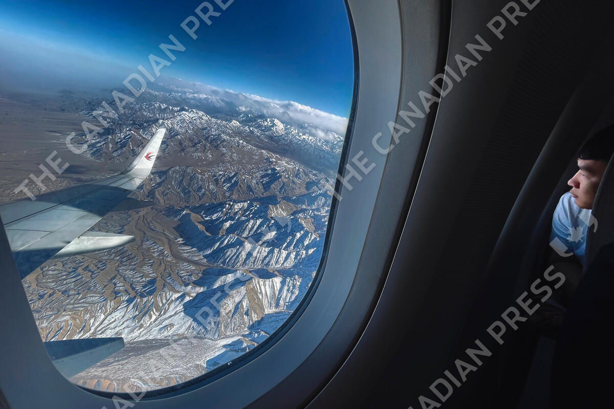 A passenger looks out from a China Eastern airliner's window as the plane flies over the snow covered mountains in Yumen, northwest China's Gansu Province, Tuesday, Oct. 24, 2023. (AP Photo/Andy Wong)