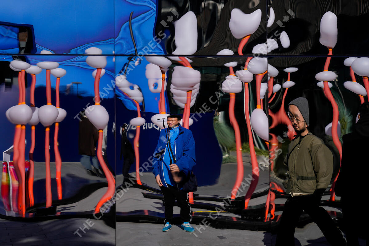 A man is reflected on a distortion panels as he takes a selfie with a lights display at an outdoor shopping mall in Beijing, Sunday, Nov. 12, 2023. (AP Photo/Andy Wong)