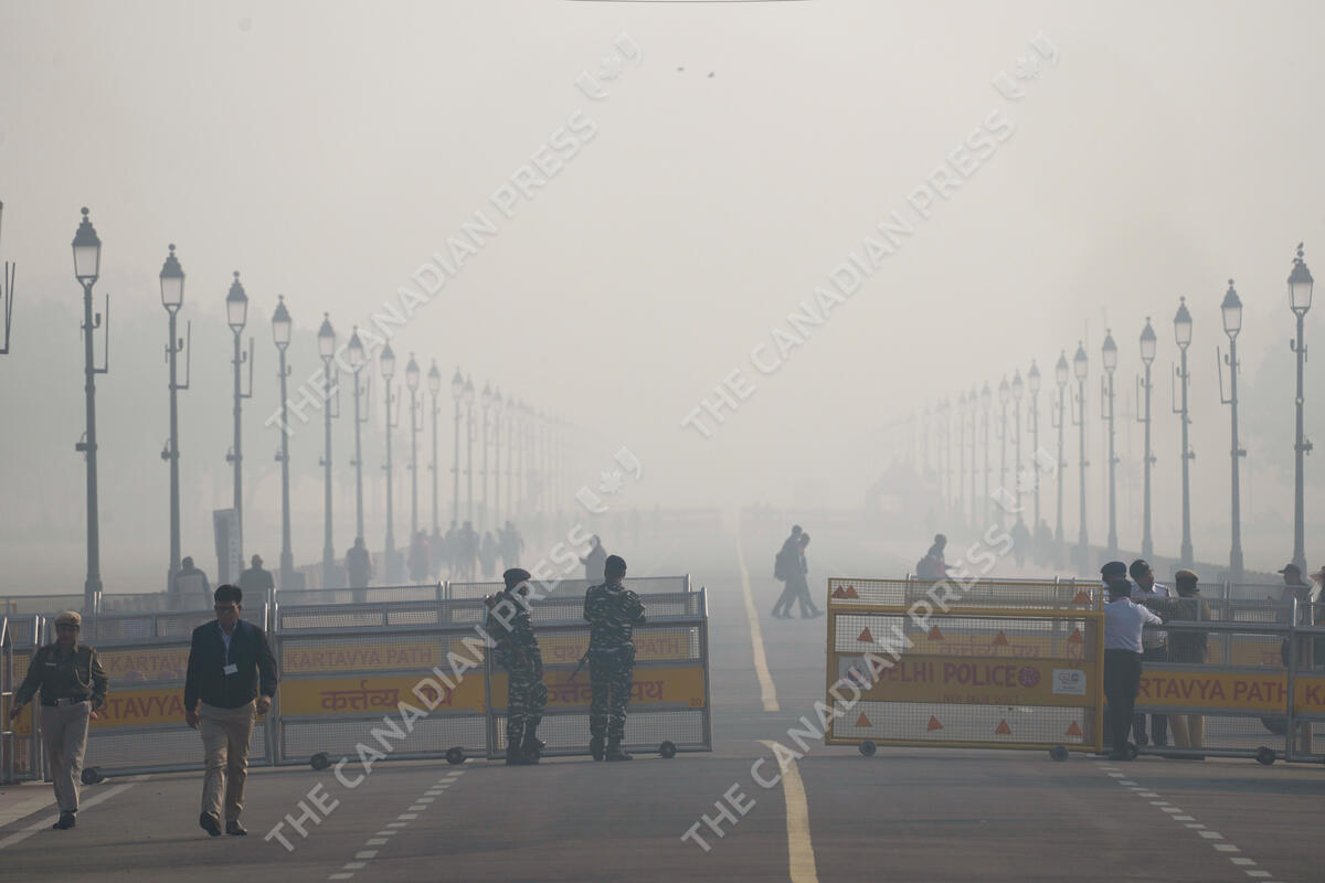 Security officers stand guard enveloped by smog early morning in New Delhi, India, Wednesday, Dec. 13, 2023. The city is witnessing an increase in the pollution level, which continued to stay within the very poor category. (AP Photo/Manish Swarup)