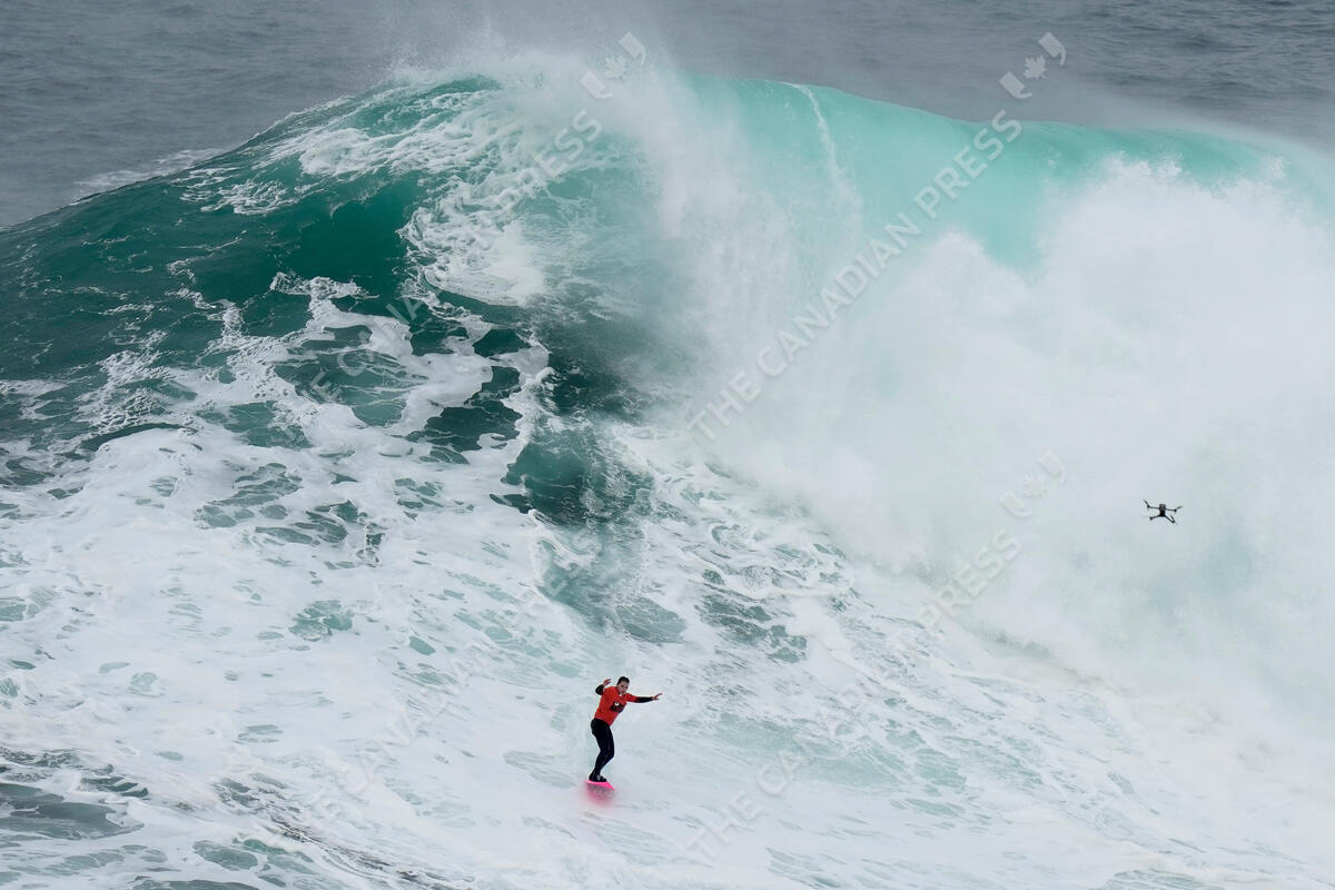 Maya Gabeira, from Brazil, rides a wave during the Nazare Big Wave Challenge surfing tournament at Praia do Norte, or North Beach, in Nazare, Portugal, Monday, Jan. 22, 2024. (AP Photo/Armando Franca)