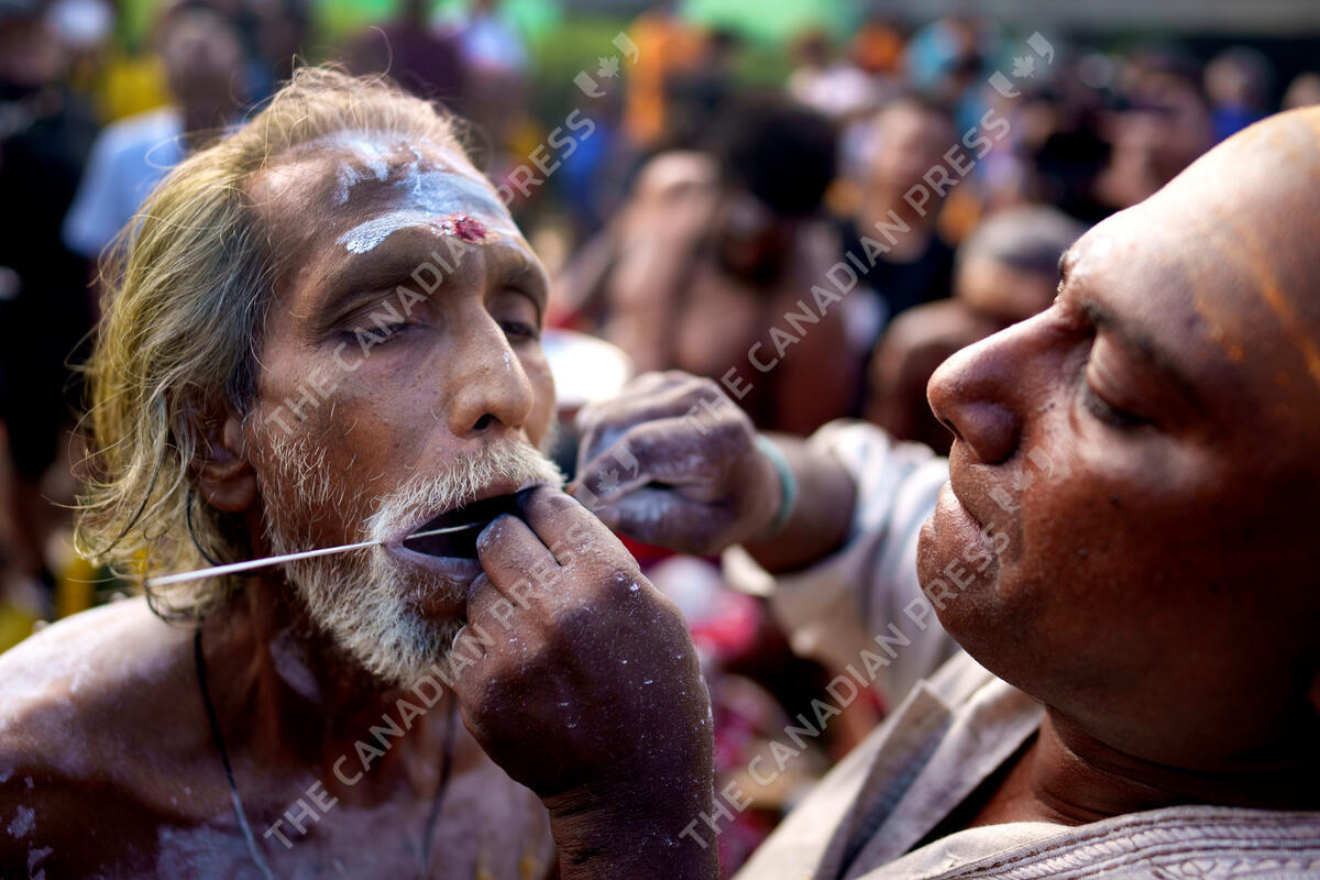 A Hindu devotee gets his tongue pierced with a metal rod during the Thaipusam festival celebrations at Batu Caves, Kuala Lumpur, Malaysia Thursday, Jan. 25, 2024. Thaipusam, which is celebrated in honor of Hindu god Lord Murugan, is an annual procession by Hindu devotees seeking blessings, fulfilling vows and offering thanks. (AP Photo/Vincent Thian)