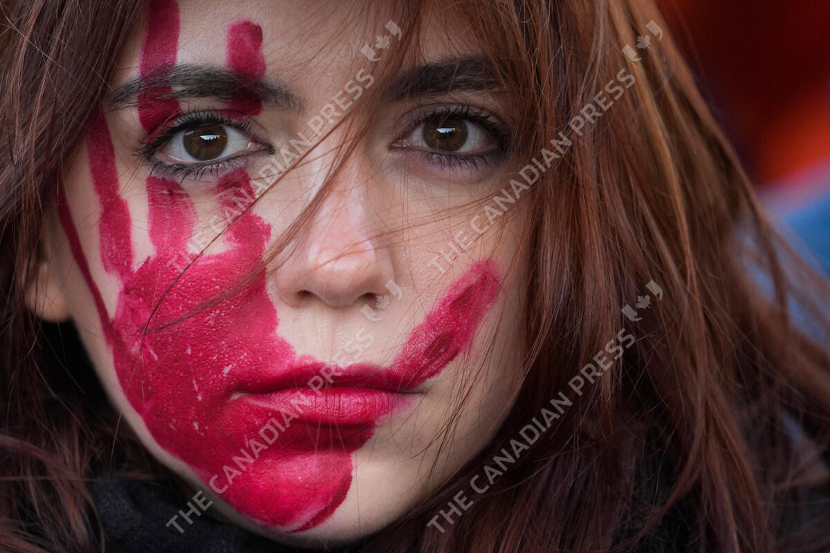 A woman attends a demonstration on the occasion of International Day for the Elimination of Violence against Women, in Milan, Italy, Saturday, Nov. 25, 2023. (AP Photo/Luca Bruno)