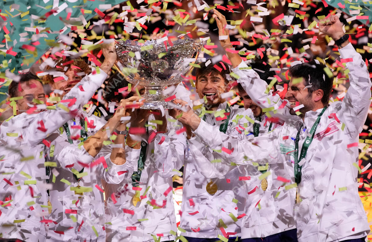 The Italian Davis Cup team celebrate with the trophy after defeating Australia during the Davis Cup final tennis matches in Malaga, Spain, Sunday, Nov. 26, 2023. Italy are the 2023 World Champions Davis Cup winners. (AP Photo/Manu Fernandez)