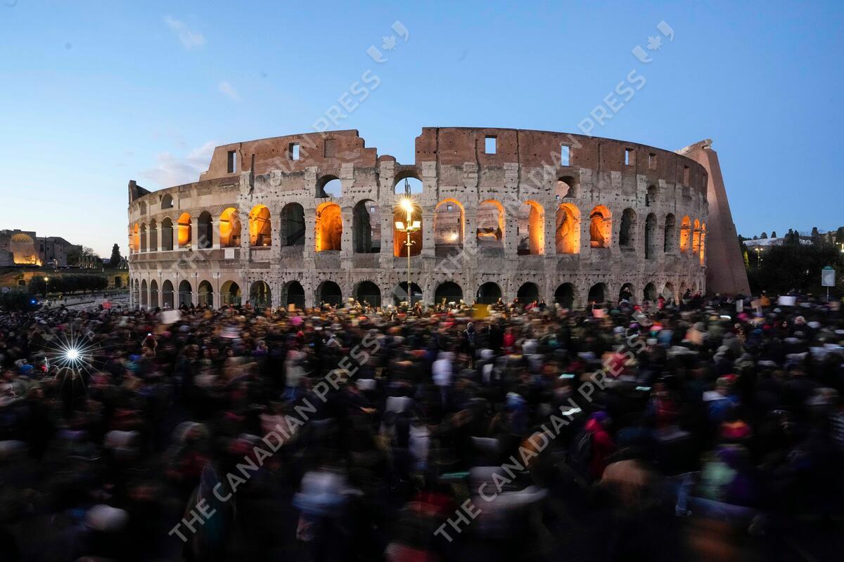 Demonstrators march on the occasion of International Day for the Elimination of Violence against Women in front of the ancient Colosseum, in Rome, Saturday, Nov.25, 2023. (AP Photo/Alessandra Tarantino)