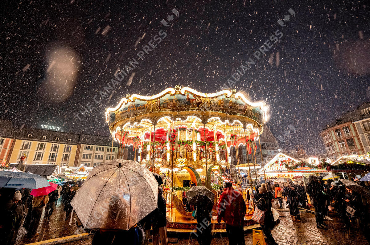 Snow falls as the traditional Christmas market with the merry-go-round was opened in Frankfurt, Germany, Monday, Nov. 27, 2023. (AP Photo/Michael Probst)