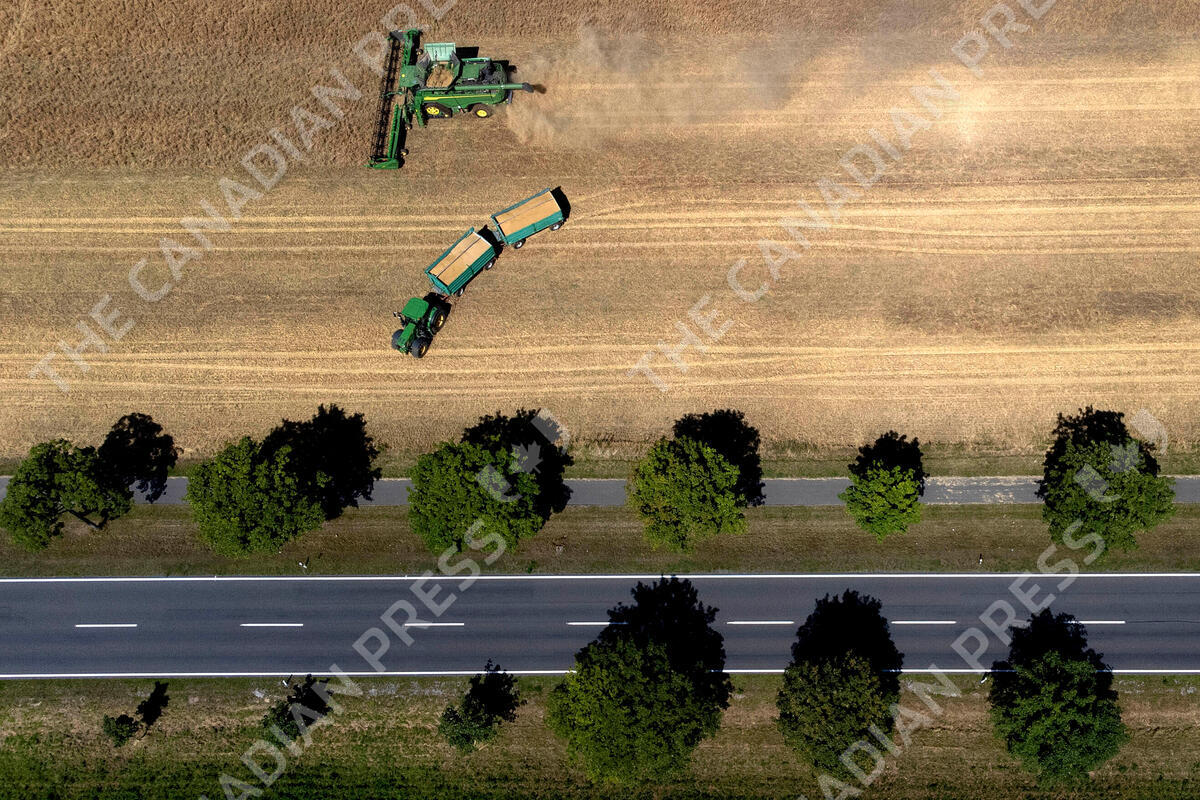 Farmers harvest a grain field near Wernigerode, Germany, Thursday, Aug. 10, 2023. (AP Photo/Matthias Schrader)