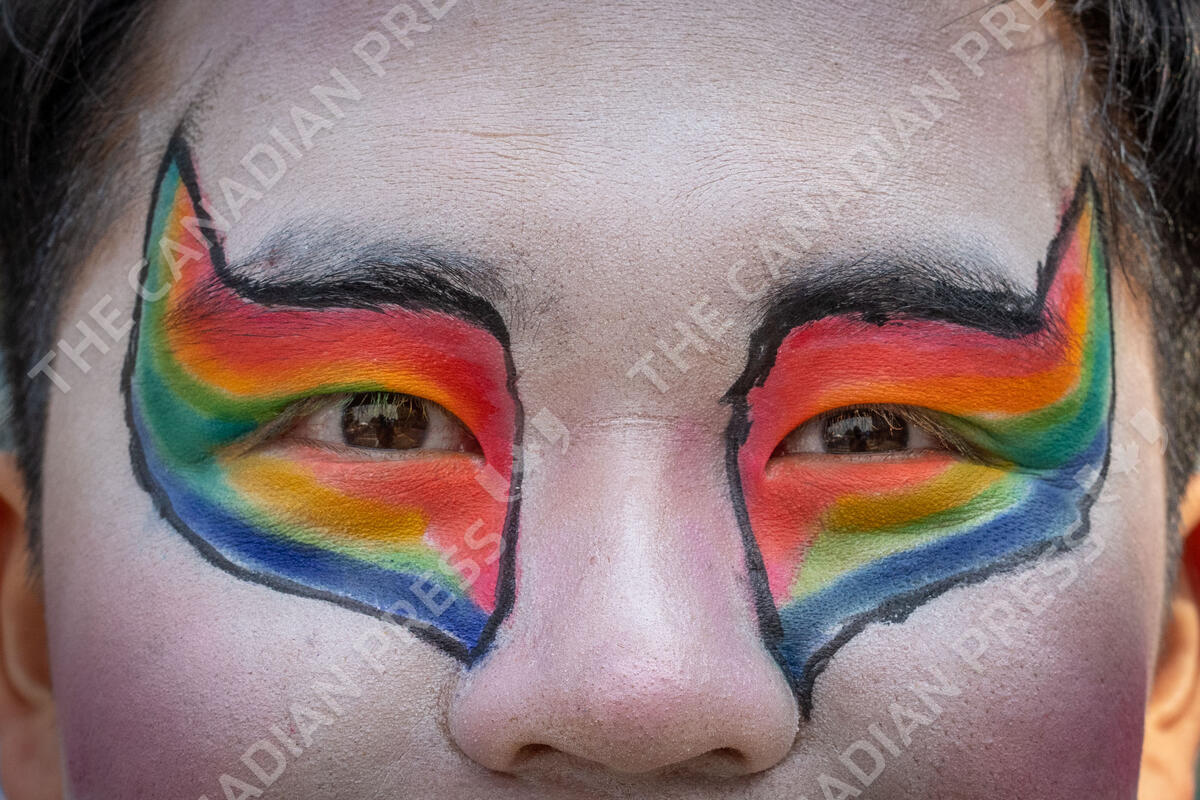A person's eye makeup is done with rainbows during the Pride Parade at English Bay in Vancouver, B.C., Sunday, Aug. 6, 2023. THE CANADIAN PRESS/Ethan Cairns