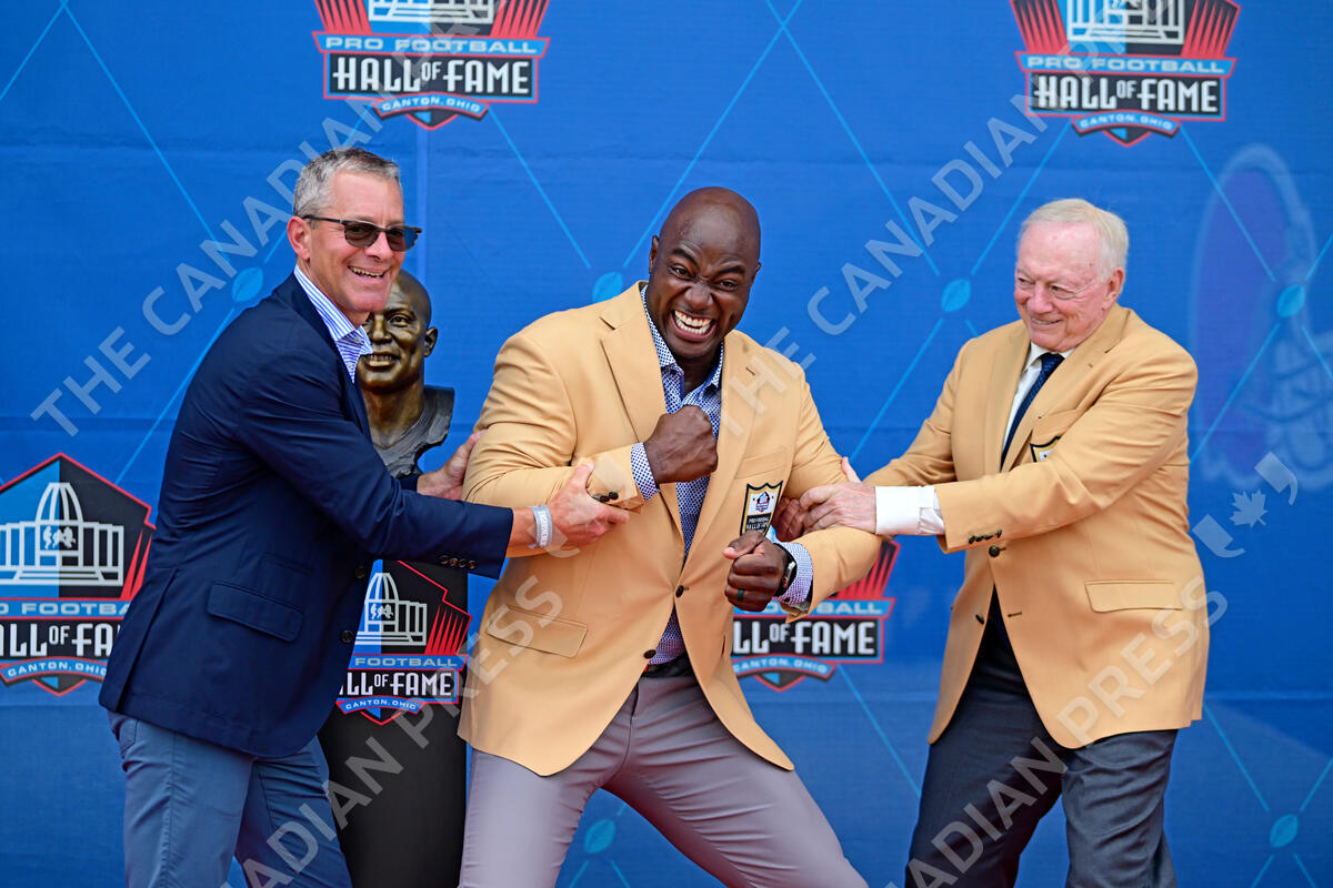 Former NFL player DeMarcus Ware, center, laughs as Greg Penner, left, owner of the Denver Broncos, and Jerry Jones, owner of the Dallas Cowboys, pretend to fight over him during his induction into the Pro Football Hall of Fame in Canton, Ohio, Saturday, Aug. 5, 2023. (AP Photo/David Dermer)