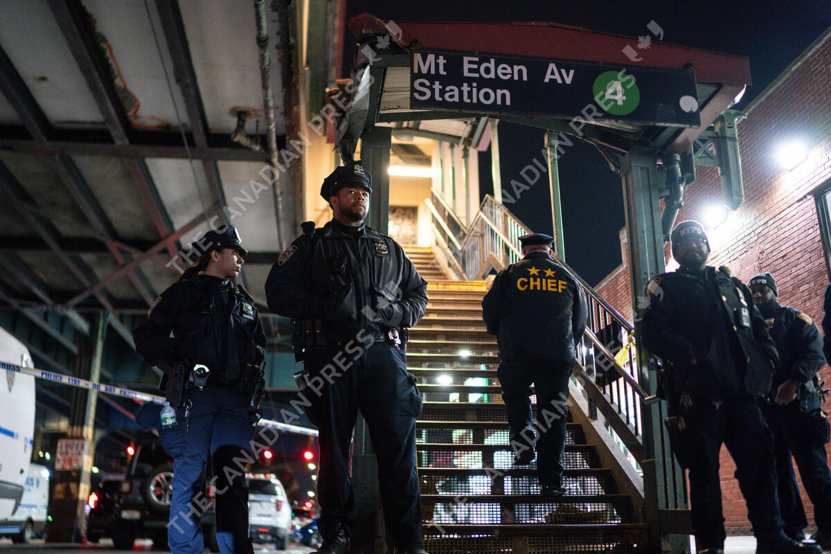 New York City Police officers stand guard following a shooting at the Mount Eden subway station, Monday, Feb. 12, 2024, in the Bronx borough of New York. (AP Photo/Eduardo Munoz Alvarez)