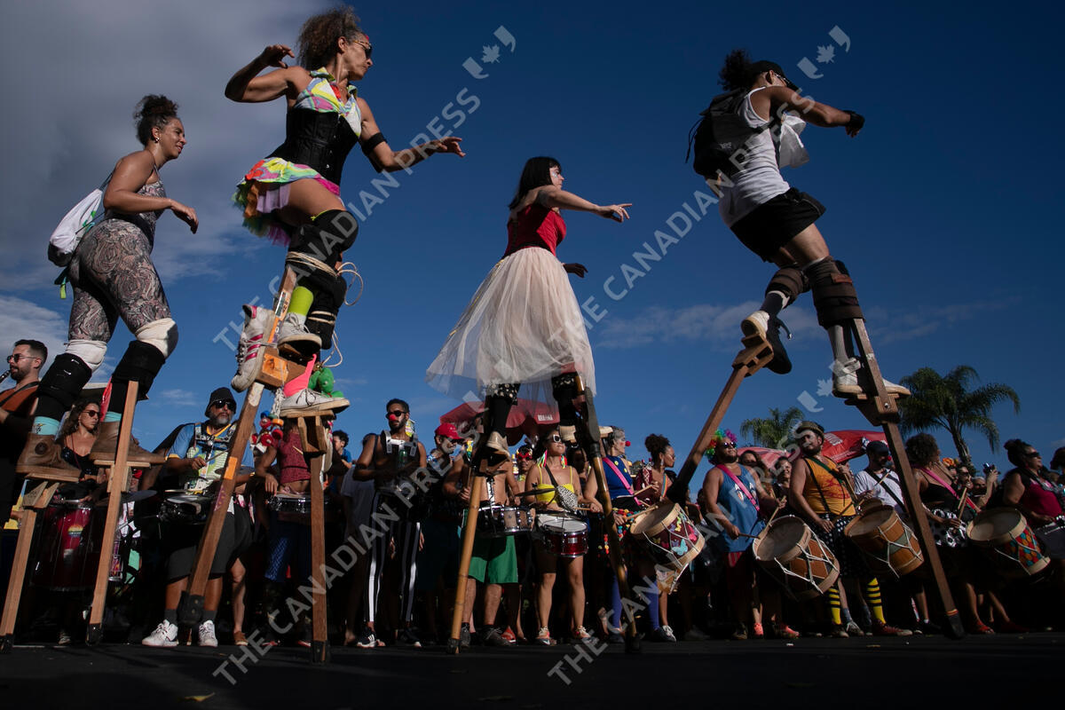 Revelers parade during a pre-carnival street party rehearsal of the "Orquestra Voadora" block in Rio de Janeiro, Brazil, Sunday, Jan. 21, 2024. (AP Photo/Bruna Prado)