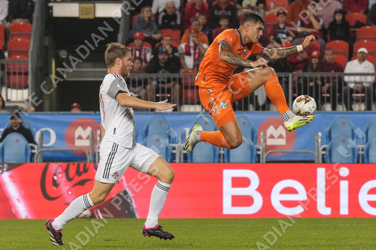 FC Cincinnati's Brandon Vázquez tries to control a cross in front of Toronto FC's Sigurd Rosted during first half MLS action in Toronto, Saturday, Sept. 30, 2023. THE CANADIAN PRESS/Chris Young