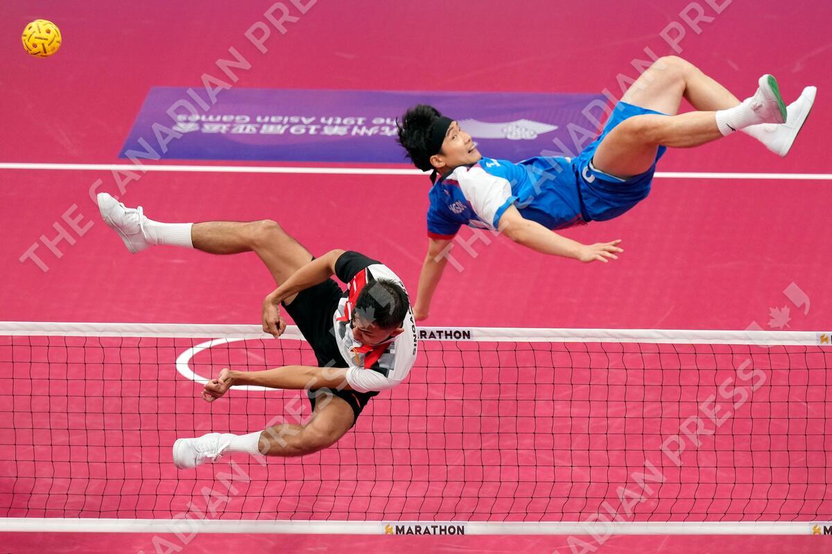 South Korea's Gong Ha-sung, right, and Singapore's Muhammad A'Fif Bin Safiee, left, compete th ball during men's sepaktakraw preliminary Group B match at Jinhua Sports Centre at the 19th Asian Games in Jinhua, China, Sunday, Oct. 1, 2023. (AP Photo/Eugene Hoshiko)