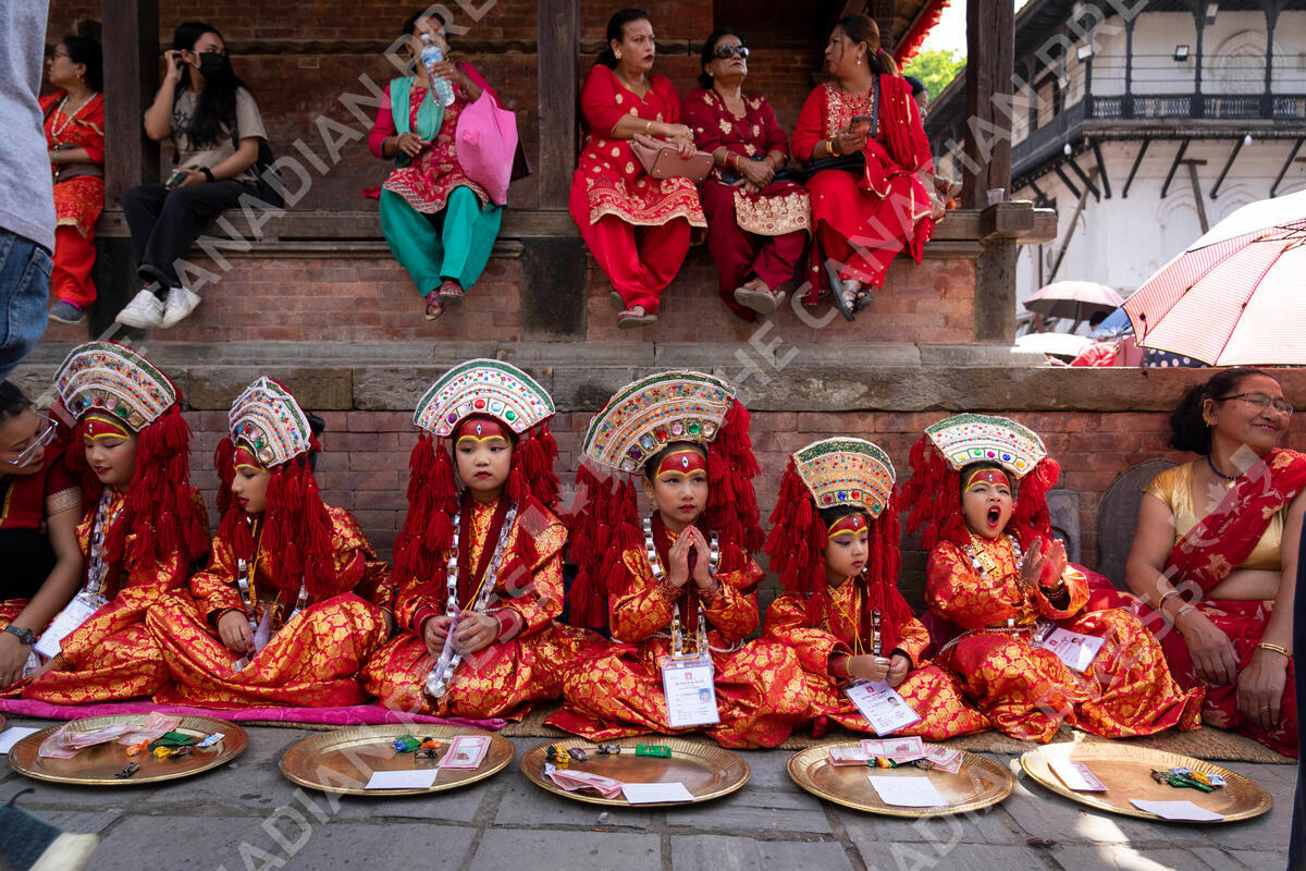 Young girls dressed as living goddess Kumari wait for Kumari Puja, a worship ritual at Hanuman Dhoka, Basantapur Durbar Square, Kathmandu, Nepal, Wednesday, Sept. 27, 2023. Girls under the age of nine gathered for the tradition of worshiping young prepubescent girls as manifestations of the divine female energy. The ritual holds a strong religious significance in the Newar community that seeks divine blessings to save small girls from diseases and bad luck in the years to come. (AP Photo/Niranjan Shrestha)