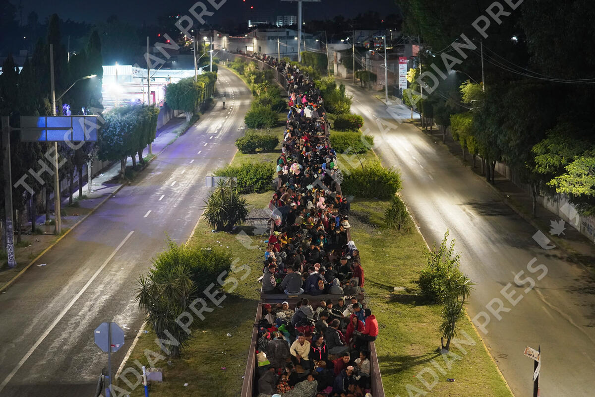 Migrants sit atop a northbound freight train, in Irapuato, Mexico, Saturday, Sept. 23, 2023. (AP Photo/Marco Ugarte)
