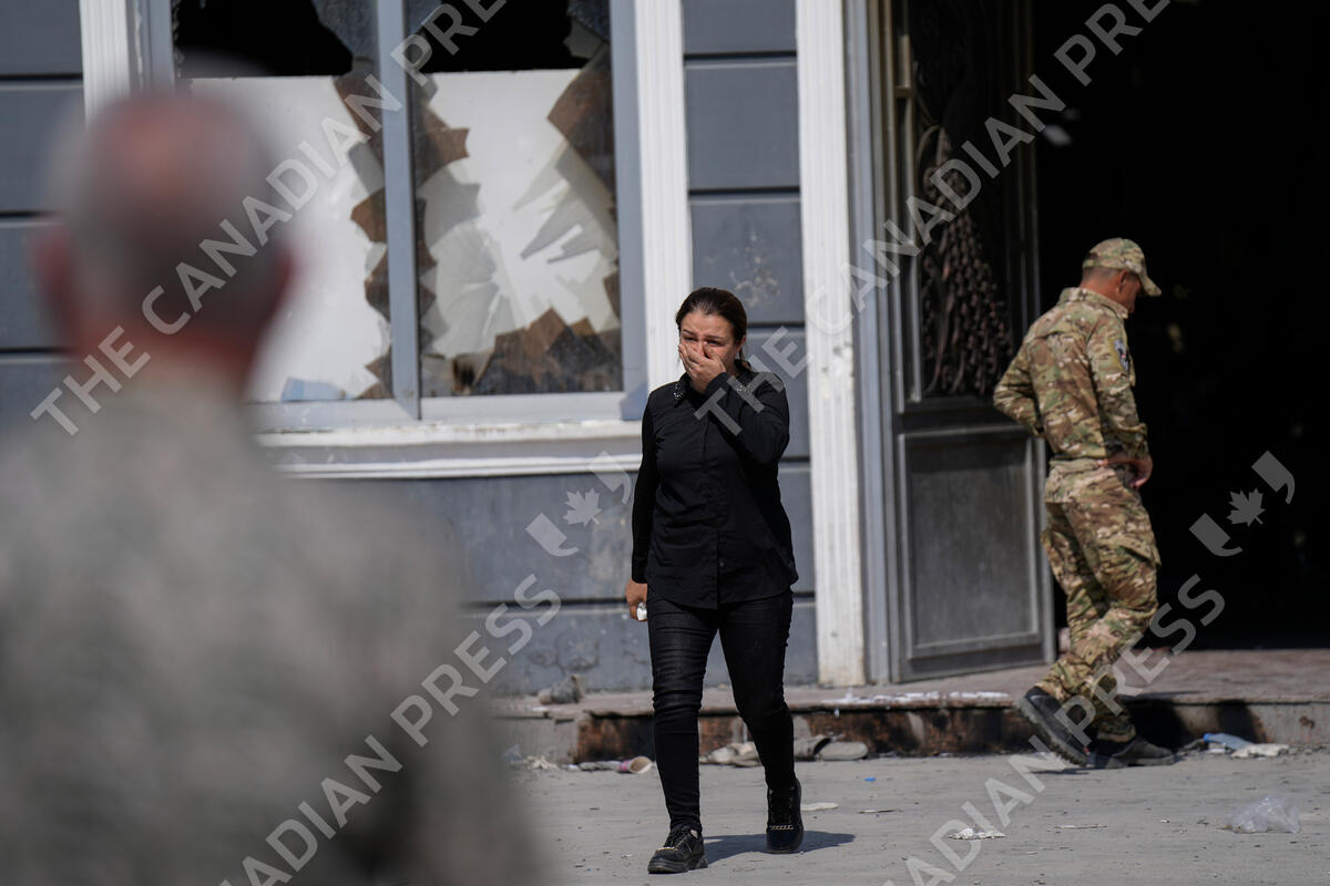 An Iraqi woman reacts at the site of a fatal fire in the district of Hamdaniya, Nineveh province, Iraq, Thursday, Sept. 28, 2023. A fire that raced through a hall hosting a Christian wedding in northern Iraq killed multiple people, authorities said. (AP Photo/Hadi Mizban)