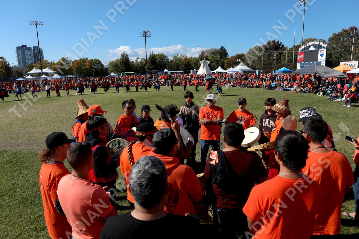 Ahousat drum circle performers sing as dancers make their way around the field during the second annual South Island Powwow at Royal Athletic Park in Victoria, Saturday, Sept. 30, 2023. THE CANADIAN PRESS/Chad Hipolito