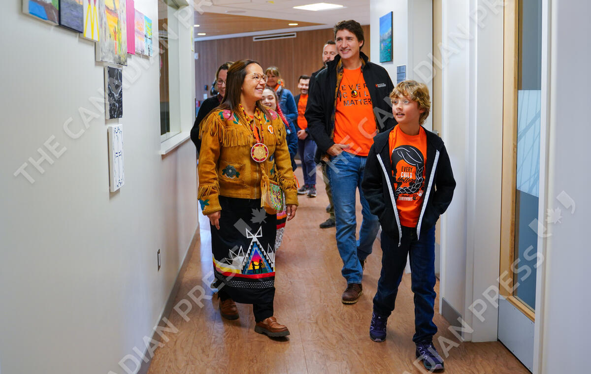 Lac La Ronge Indian Band Chief Tammy Cook-Searson, left to right, Prime Minister Justin Trudeau, and his son Hadrien walk during a tour of Woodland Wellness Centre on National Day for Truth and Reconciliation in La Ronge, Sask., Saturday, Sept. 30, 2023. THE CANADIAN PRESS/Heywood Yu