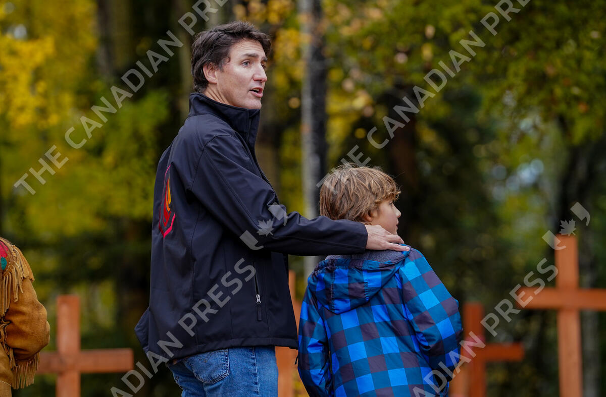 Prime Minister Justin Trudeau, left, and his son Hadrien, right, look on while visiting a cemetery on National Day for Truth and Reconciliation in La Ronge, Sask., Saturday, Sept. 30, 2023. THE CANADIAN PRESS/Heywood Yu