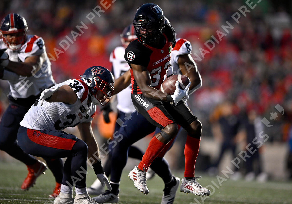 Ottawa Redblacks defensive back Brandin Dandridge (37) spins to evade Montreal Alouettes fullback Alexandre Gagné (34), during second half CFL football action in Ottawa, Saturday, Sept. 30, 2023. THE CANADIAN PRESS/Justin Tang