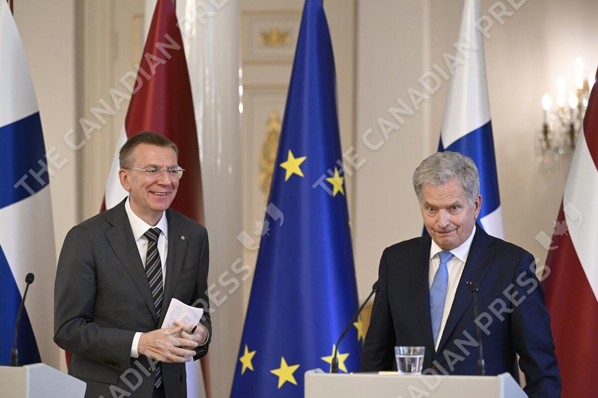 Latvian President Edgars Rinkevics (L) and Finnish President Sauli Niinistö react during their joint press conference after their meeting at the Presidential Palace in Helsinki, Finland, on September 28, 2023. President Rinkevics is on a working visit to Finland. LEHTIKUVA / MARKKU ULANDER - FINLAND OUT. NO THIRD PARTY SALES.