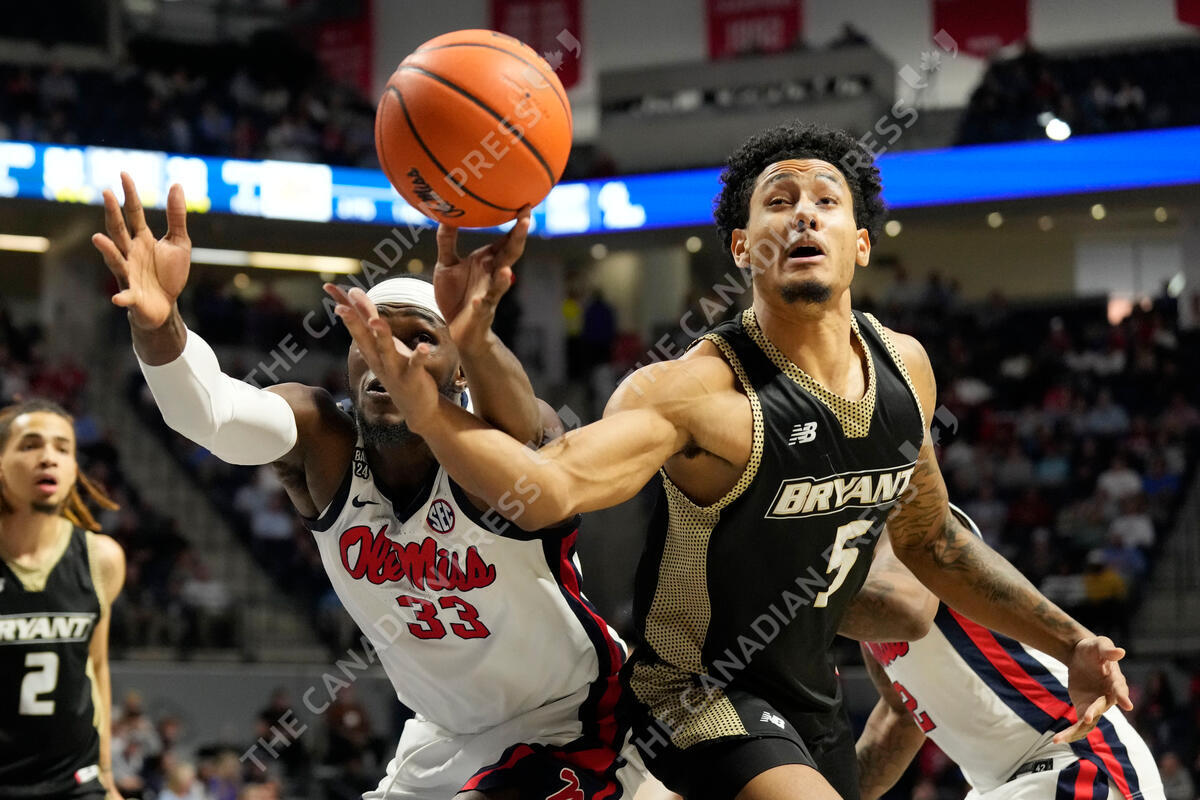 Mississippi forward Moussa Cisse (33) and Bryant forward Daniel Rivera (5) reach for a rebound during the second half of an NCAA college basketball game, Sunday, Dec. 31, 2023, in Oxford, Miss. (AP Photo/Rogelio V. Solis)