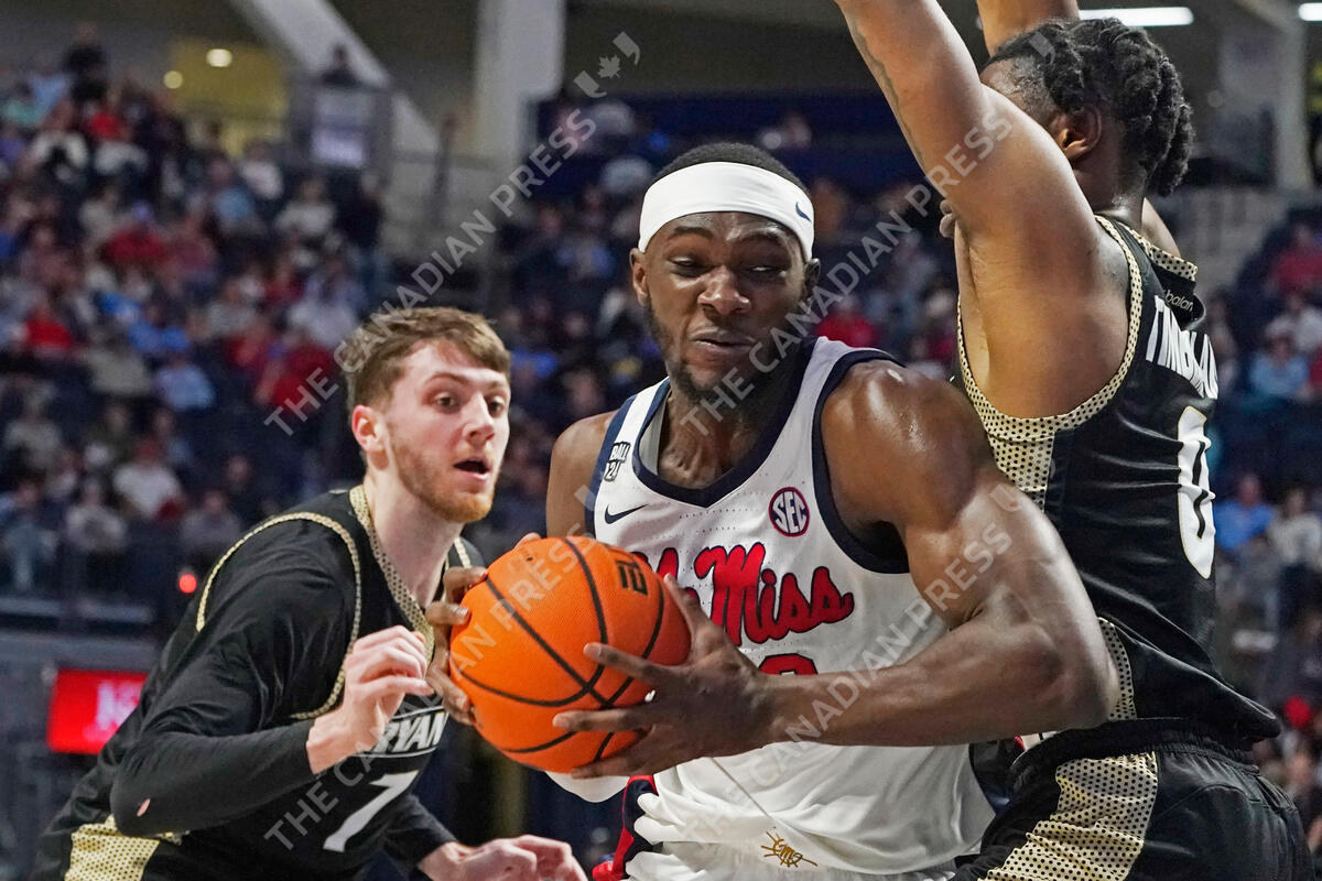Mississippi forward Moussa Cisse, center, pushes back against Bryant guard Earl Timberlake right, after pulling down a rebound while Bryant forward Connor Withers (7) tries to steal the ball during the second half of an NCAA college basketball game, Sunday, Dec. 31, 2023, in Oxford, Miss. (AP Photo/Rogelio V. Solis)