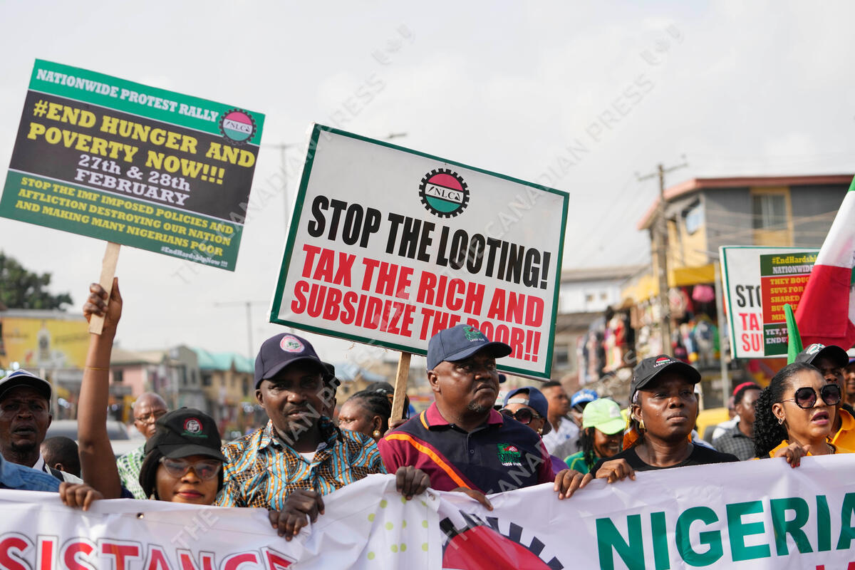 Labour unionist march on the streets to protest economic hardship in Lagos Nigeria, Tuesday, Feb. 27, 2024. Nigerian Labour Union workers began a new nationwide protest Tuesday, that threatens to shut down key services across the country. Protestors are angry at the growing economic hardship with talks late Monday night breaking down to avert the walkout. (AP Photo/Sunday Alamba)