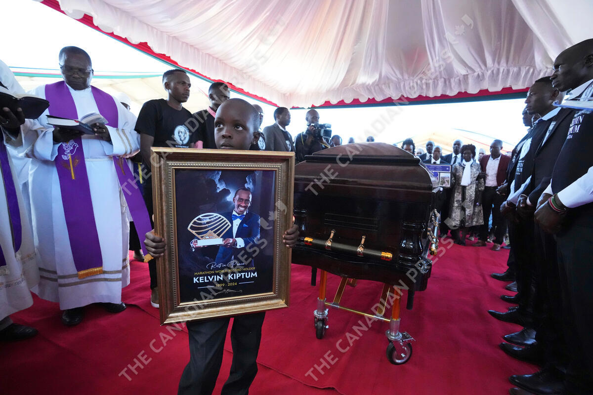 Caleb Kigen the son of marathon record holder Kelvin Kiptum, holds his late father's portrait ahead of his burial, in Elgeyo Marakwet, Kenya, Friday Feb. 23, 2024. World marathon record holder Kelvin Kiptum was buried Friday following his death in a road accident, as Kenyans castigated the government for not doing enough to protect and support country's famed athletes. (AP Photo/Brian Inganga)