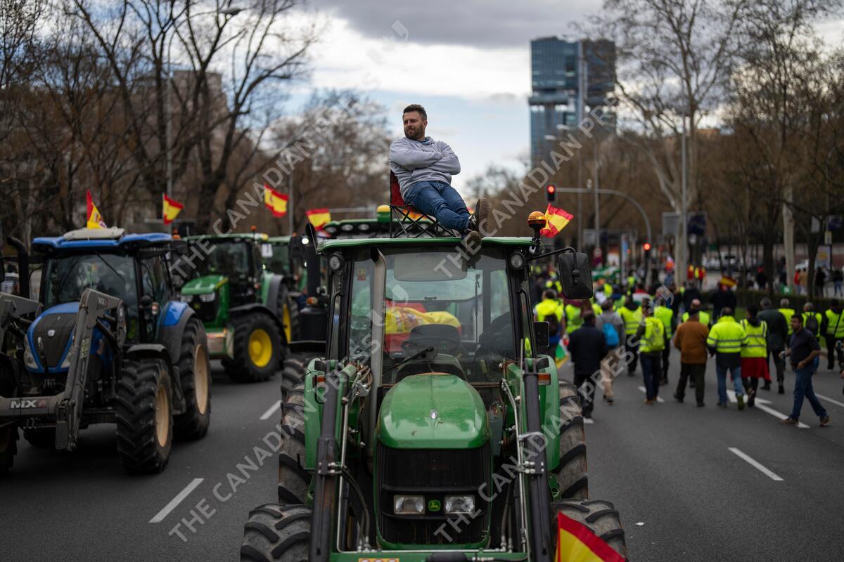 A farmer sits atop a tractor during a protest outside the European Parliament offices in Madrid, Spain, Monday, Feb. 26, 2024. (AP Photo/Bernat Armangue)