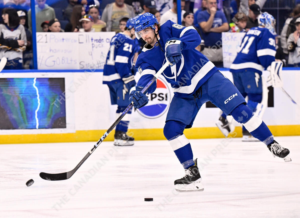 Tampa Bay Lightning defenseman Maxwell Crozier (65) warms up before an NHL hockey game against the Buffalo Sabres Thursday, Feb. 29, 2024, in Tampa, Fla. (AP Photo/Jason Behnken)