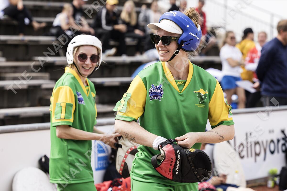 Australian players (in green jersey) are seen during the Pesäpallo World Cup match between Australia and Germany in Hyvinkää, Finland, on July 26, 2023. Finnish national game pesäpallo celebrated its 100th anniversary 2022. The World Cup tournament is part of festivities although it was postponed until 2023 because of uncertainties related to global covid-19 situation. LEHTIKUVA / RONI REKOMAA - FINLAND OUT. NO THIRD PARTY SALES.
