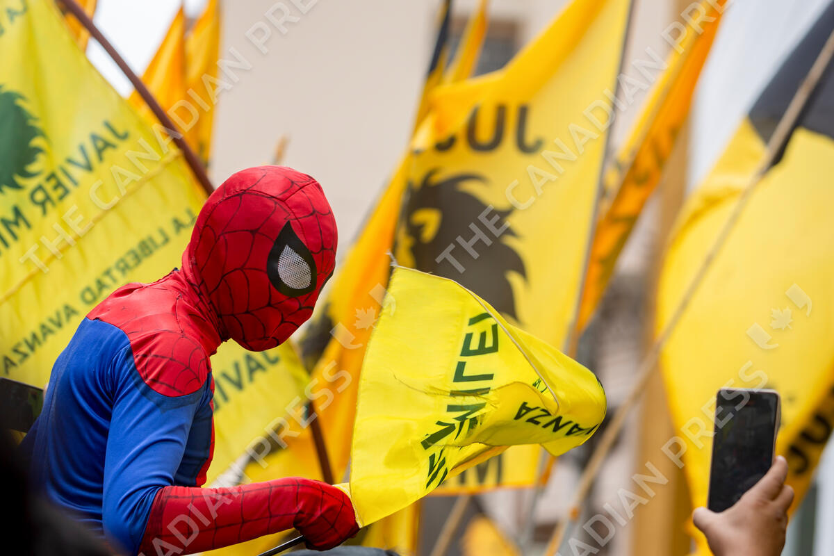A Spiderman costume wearing supporter of presidential hopeful of the Liberty Advances coalition, Javier Milei, gathers with other supporters outside the hotel where he arrived in Salta, Argentina, Thursday, Oct. 12, 2023. Elections are set for Oct. 22. (AP Photo/Javier Corbalan)