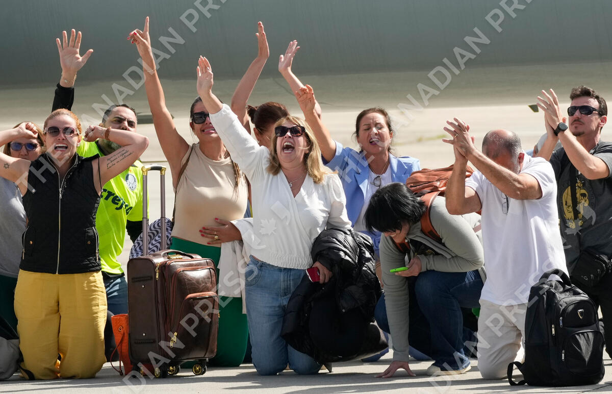 Brazilians who were caught in the latest Israel-Palestinian war kneel down in thanks on the tarmac as journalists cover their arrival to the Air Force air base in Rio de Janeiro, Brazil, Wednesday, Oct. 11, 2023. The Brazilian Air Force flew its citizens home, first landing in Brasilia. (AP Photo/Silvia Izquierdo)