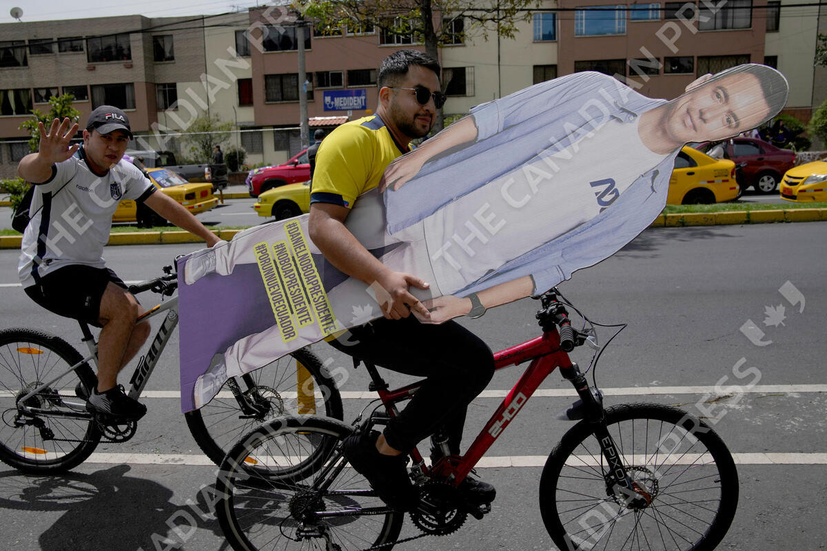 A supporter of Presidential candidate Daniel Noboa, of the National Democratic Action Alliance political party, carries a cardboard cutout of Noboa, as he bikes to attend a political rally in Quito, Ecuador, Wednesday, Oct. 11, 2023. (AP Photo/Dolores Ochoa)