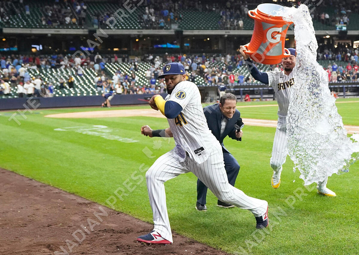 Milwaukee Brewers' Carlos Santana dodges being doused by Willy Adames after the team's win over the Philadelphia Phillies in a baseball game in Milwaukee, Saturday, Sept. 2, 2023. (AP Photo/Kayla Wolf)