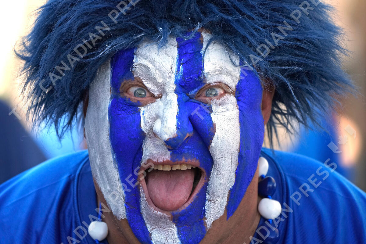A BYU fan with a painted face shows his support before an NCAA college football game against Southern Utah, Saturday, Sept. 9, 2023, in Provo, Utah. (AP Photo/Rick Bowmer)