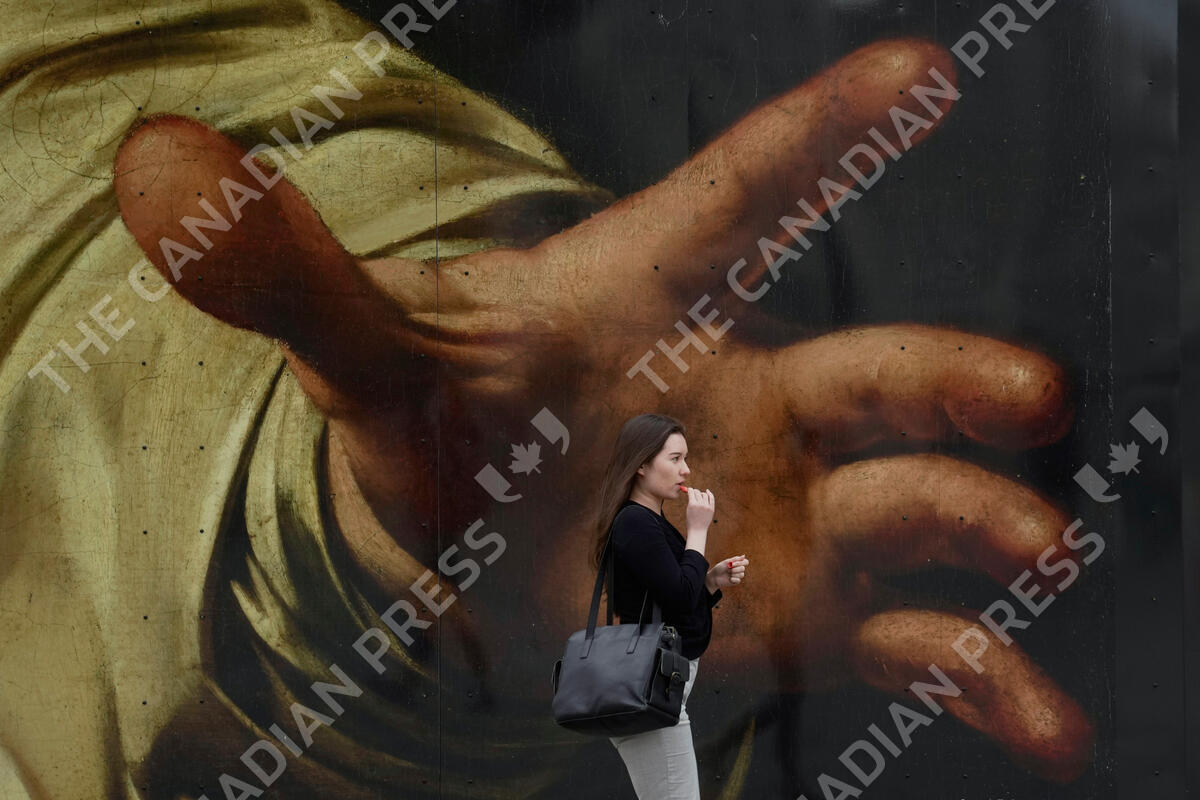 A woman walks past a poster featuring the painting of Caravaggio's "The Supper at Emmaus" outside the National Gallery, in London, Wednesday, Sept. 13, 2023. (AP Photo/Kin Cheung)