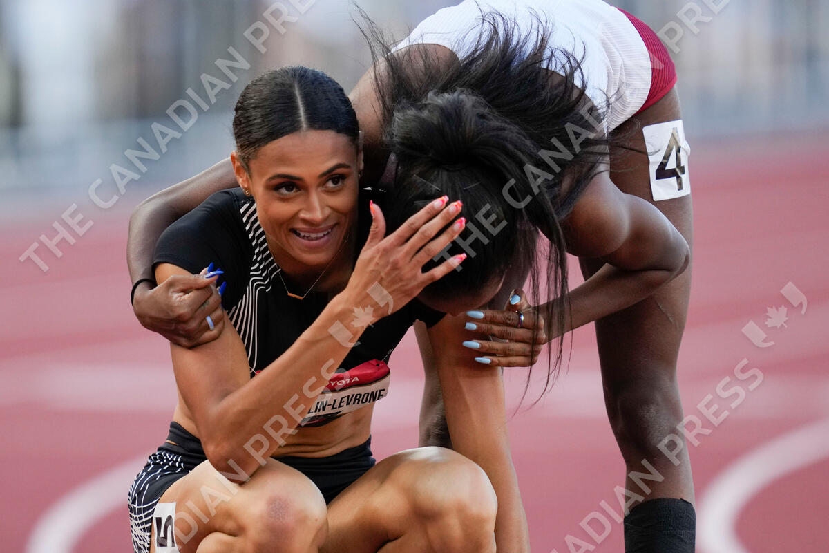 Sydney McLaughlin-Levrone is congratulated by second place finisher Britton Wilson after winning the women's 400 meter final during the U.S. track and field championships in Eugene, Ore., Saturday, July 8, 2023. (AP Photo/Ashley Landis)