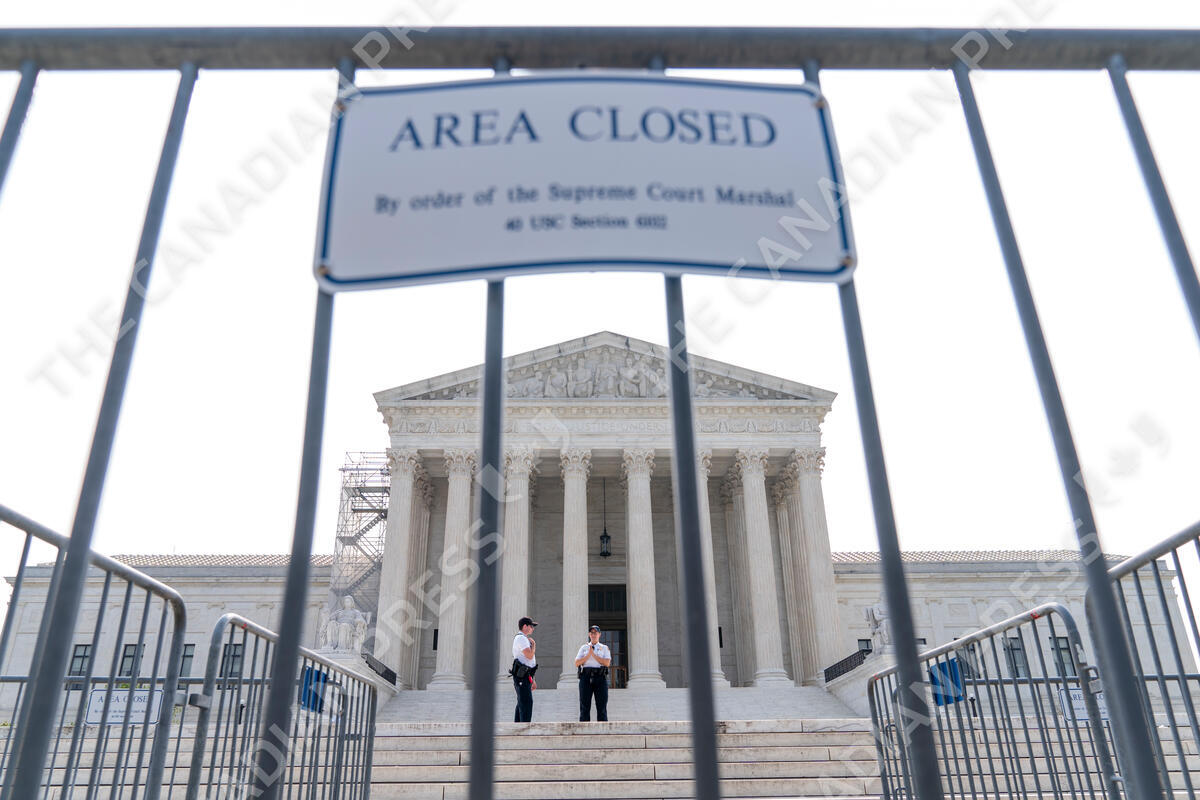Guards stand on the steps of the Supreme Court, Friday, June 30, 2023, as decisions are expected in Washington. A year after its sweeping gun rights ruling, the Supreme Court has agreed to decide whether judges are going too far in striking down restrictions on firearms. The justices said Friday they will hear the Biden administration's appeal of one such ruling that struck down as unconstitutional a federal law meant to keep guns away from people who have domestic violence restraining orders against them. (AP Photo/Jacquelyn Martin)