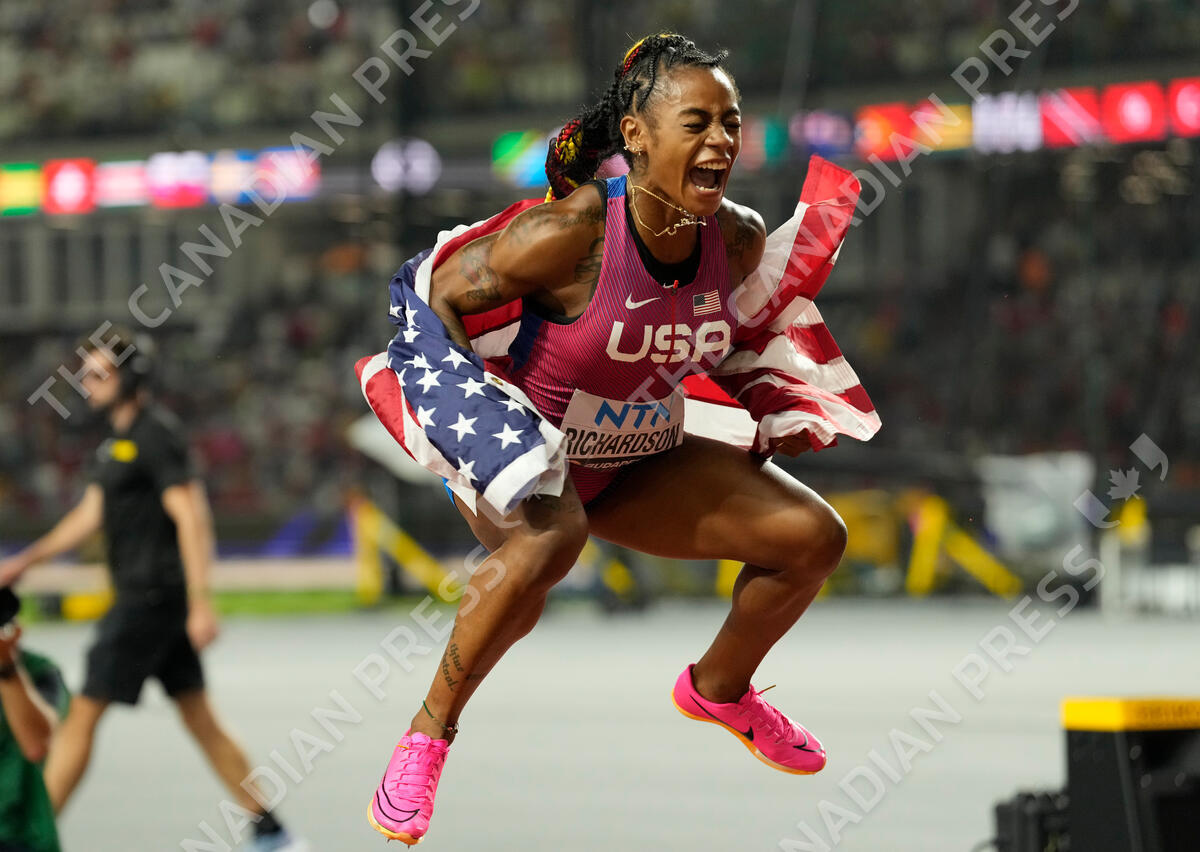 Sha'Carri Richardson, of the United States, shouts out as she celebrates with her gold medal for winning the women's 100 meters during the World Athletics Championships in Budapest, Hungary, Monday, Aug. 21, 2023. (AP Photo/Ashley Landis)